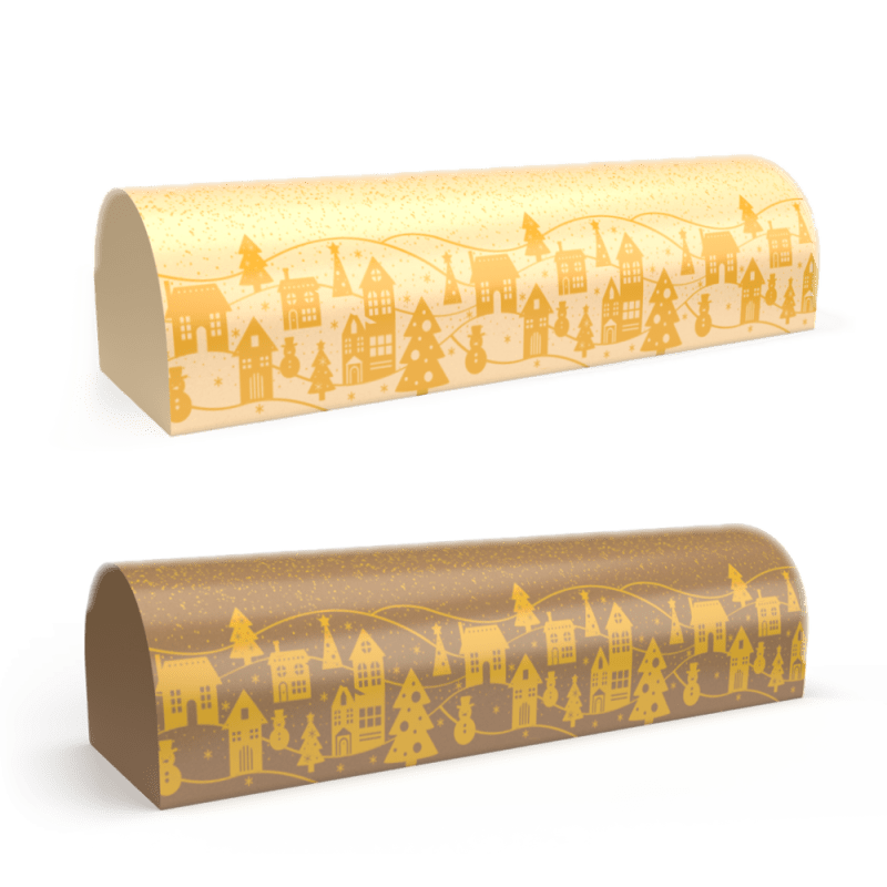 Snow Village PVC transfer sheet with a white winter landscape with houses print based on sugar. For creating a printed Christmas Buche. Perfect fit with our Buche Mould Madrid F000087. Product From Natural Origin, free from Titanium Dioxide and suitable for vegans. Dimensions of the transfer sheet are 163 x 264mm. Each pack contains 60 transfer sheets. Tip for Christmas.