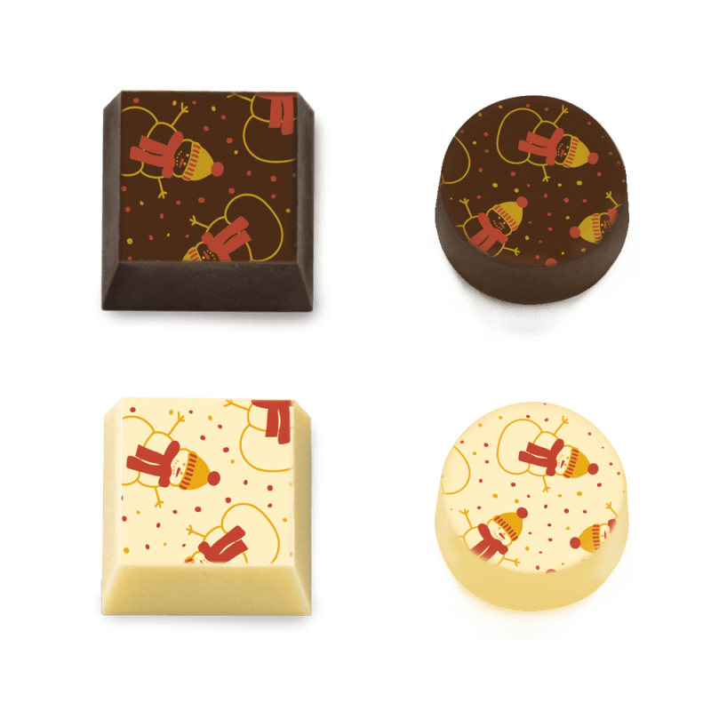 Snowy Men transfer sheet with a red and yellow snowmen print based on sugar for chocolate and other confectionery. Product From Natural Origin, free from Titanium Dioxide and suitable for vegans. Dimensions are 300 x 400mm. Each pack contains 30 transfer sheets. Tip for Christmas.