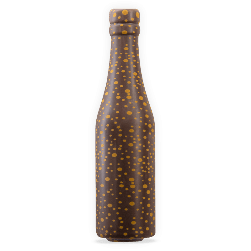 3D Chocolate decoration champagne bottle, made of dark Belgian chocolate with a gold bubbles print based on sugar. Product From Natural Origin and free from Titanium Dioxide. This product is light sensitive. Dimensions are 80 x 20mm. Each pack contains 63 bottles. Tip for Christmas. Tip for New Year's Eve.