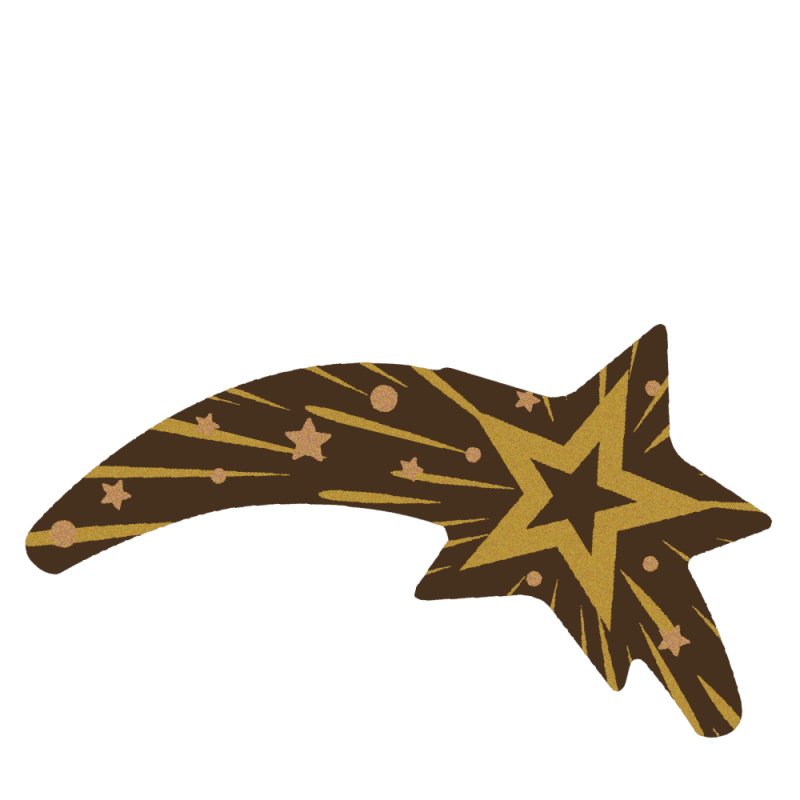 2D Chocolate decoration, chocolate shape falling star made of dark Belgian chocolate with a bronze and gold falling star print based on sugar. Product From Natural Origin and free from Titanium Dioxide. This product is light sensitive. Dimensions are 46 x 87mm. Each pack contains 84 plaques. Tip for Christmas.
