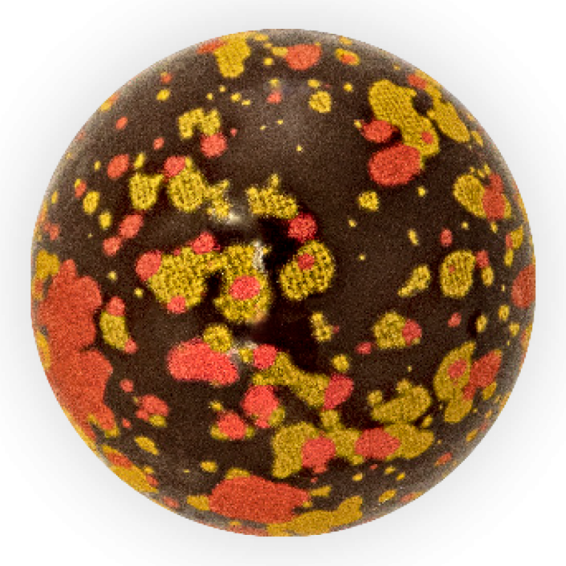 3D Chocolate decoration Splashes ball made of dark Belgian chocolate with gold and red splashes print based on sugar. Print colors are From Natural Origin and TiO2-free. Dimensions are 65 x 65mm. Each pack contains 63 balls. Tip for Christmas.