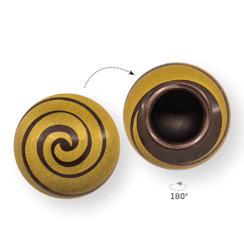 Chocolate shell for desserts with an opening to easily fill it with mousse, ice cream, ganache, cream or praline filling. The chocolate decoration Dessert Swirl Shell Gold Dark is made of dark Belgian chocolate with a gold swirl print based on sugar. Print colors are From Natural Origin and TiO2-free. Dimensions are 65 x 65mm. Each pack contains 20 spheres