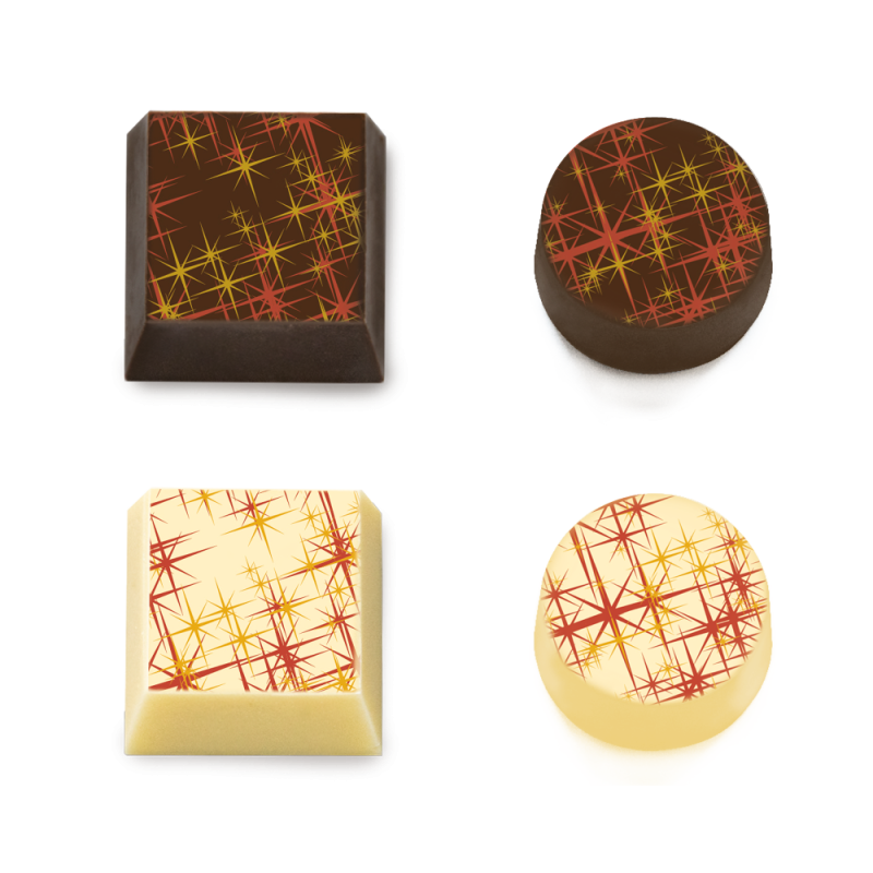 Tillo 3 transfer sheet with a red and yellow twinkling stars print based on sugar for chocolate and other confectionery. Product From Natural Origin, free from Titanium Dioxide and suitable for vegans. Dimensions are 300 x 400mm. Each pack contains 30 transfer sheets. Tip for Christmas. Tip for Celebrations.