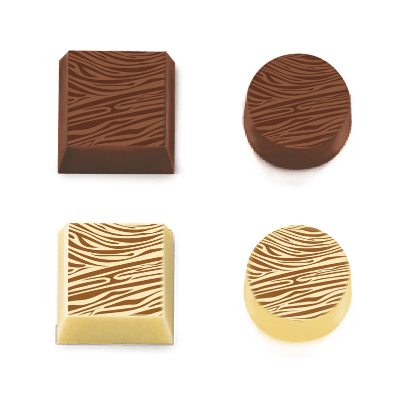 Timber transfer sheet with a brown Cocoart wood fine print based on sugar for chocolate and other confectionery. Printing colors are From Natural Origin, and Titanium Dioxide-Free and E-Free. Dimensions are 300 x 400mm. Each pack contains 30 transfer sheets. Also available on rolls for industrial use.