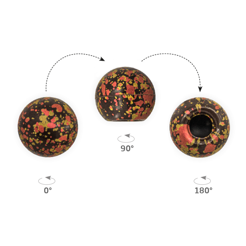 Chocolate decoration Truffle Shell Splatters for creating truffles, made of dark Belgian chocolate with a gold and red splatters print based on sugar. Print colors are From Natural Origin and TiO2-free. Our truffle shells have an opening to easily fill them with mousse, ice cream, ganace, cream of praline filling. Dimensions are 25 x 25mm. Each pack contains 63 pieces.