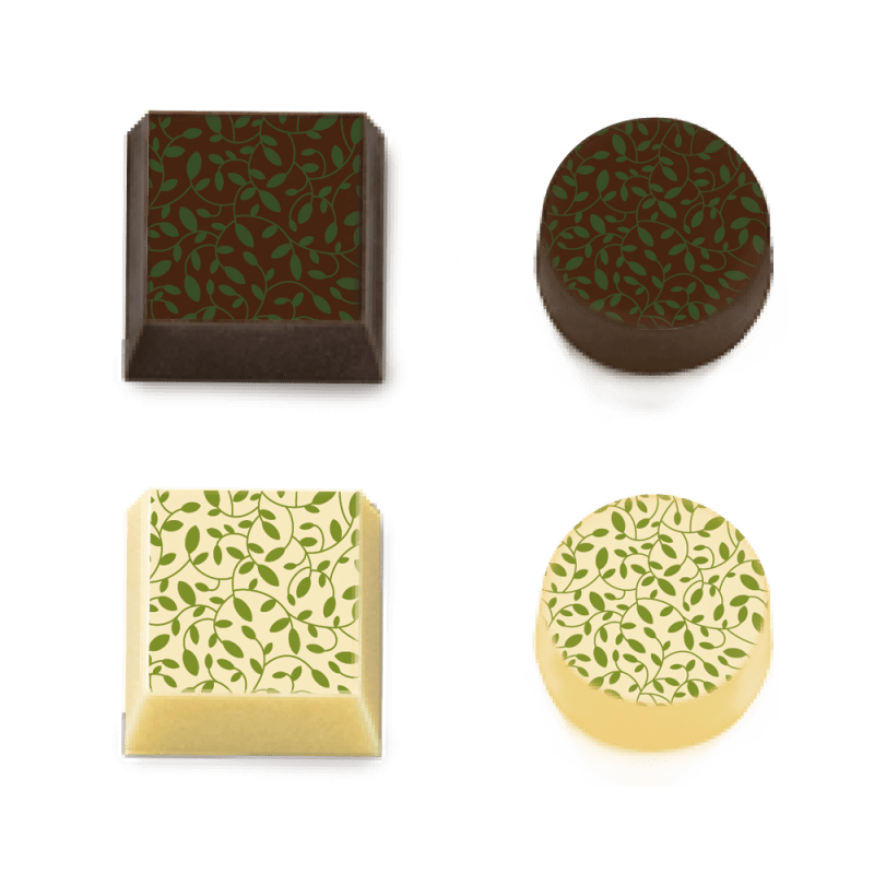 Tuscan Leaves transfer sheet with a green swirly botanical print based on sugar for chocolate and other confectionery. Printing colors are From Natural Origin and Titanium Dioxide Free. Dimensions are 300 x 400mm. Each pack contains 30 transfer sheets. Also available on rolls for industrial use.