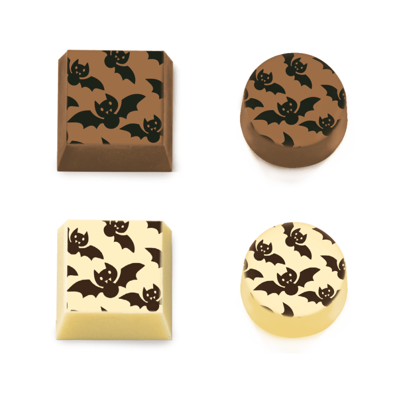 Vampy transfer sheet with a black bats Cocoart print based on sugar. For printing on chocolate and other confectionery. Product From Natural Origin, free from Titanium Dioxide, E-number free and suitable for vegans. Dimensions are 300 x 400mm. Each pack contains 30 transfer sheets. Tip for Halloween.