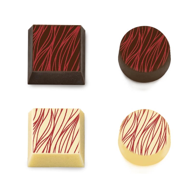 Waves transfer sheet with a red wavy print based on sugar for chocolate and other confectionery. Printing colors are From Natural Origin and Titanium Dioxide Free. Dimensions are 300 x 400mm. Each pack contains 30 transfer sheets. Also available on rolls for industrial use.