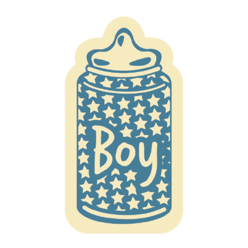 2D Chocolate decoration, chocolate shape baby bottle made of white Belgian chocolate with a blue stars and "Boy" print based on sugar. Print colors are From Natural Origin and TiO2-free. Dimensions are 55 x 30mm. Each pack contains 140 bottles.