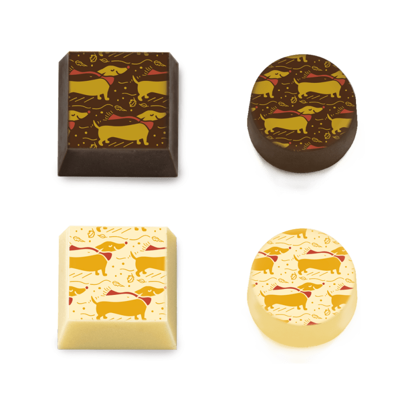 Winter Dog transfer sheet with a yellow dachshund with a red scarf print based on sugar for chocolate and other confectionery. Product From Natural Origin, free from Titanium Dioxide and suitable for vegans. Dimensions are 300 x 400mm. Each pack contains 30 transfer sheets. Tip for Christmas.