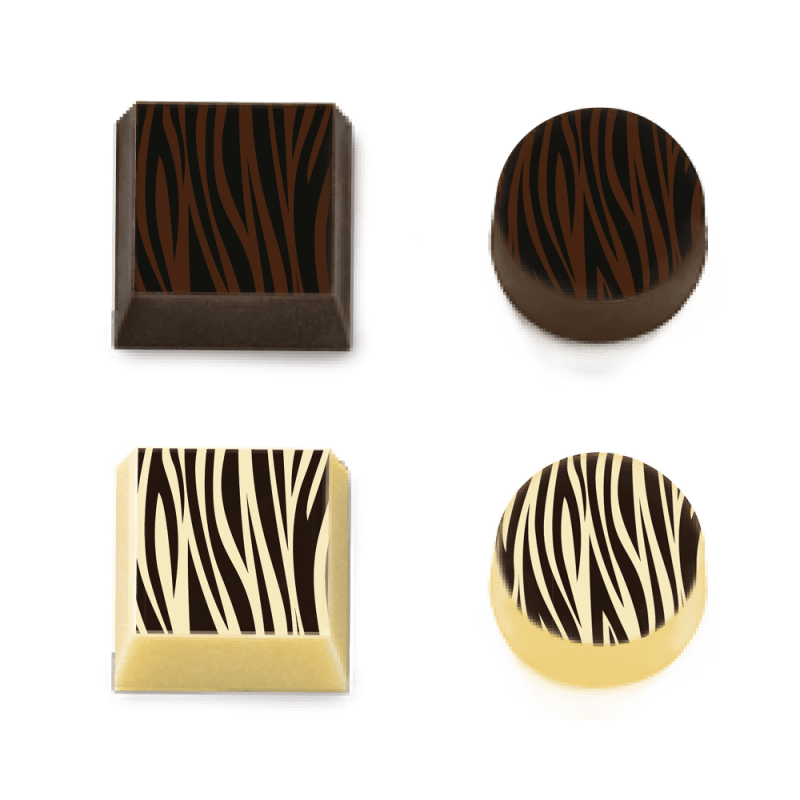 Zebra Stripes transfer sheet with a black Cocoart zebra stripes print based on sugar for chocolate and other confectionery. Printing colors are From Natural Origin, and Titanium Dioxide-Free and E-Free. Dimensions are 300 x 400mm. Each pack contains 30 transfer sheets. Also available on rolls for industrial use.